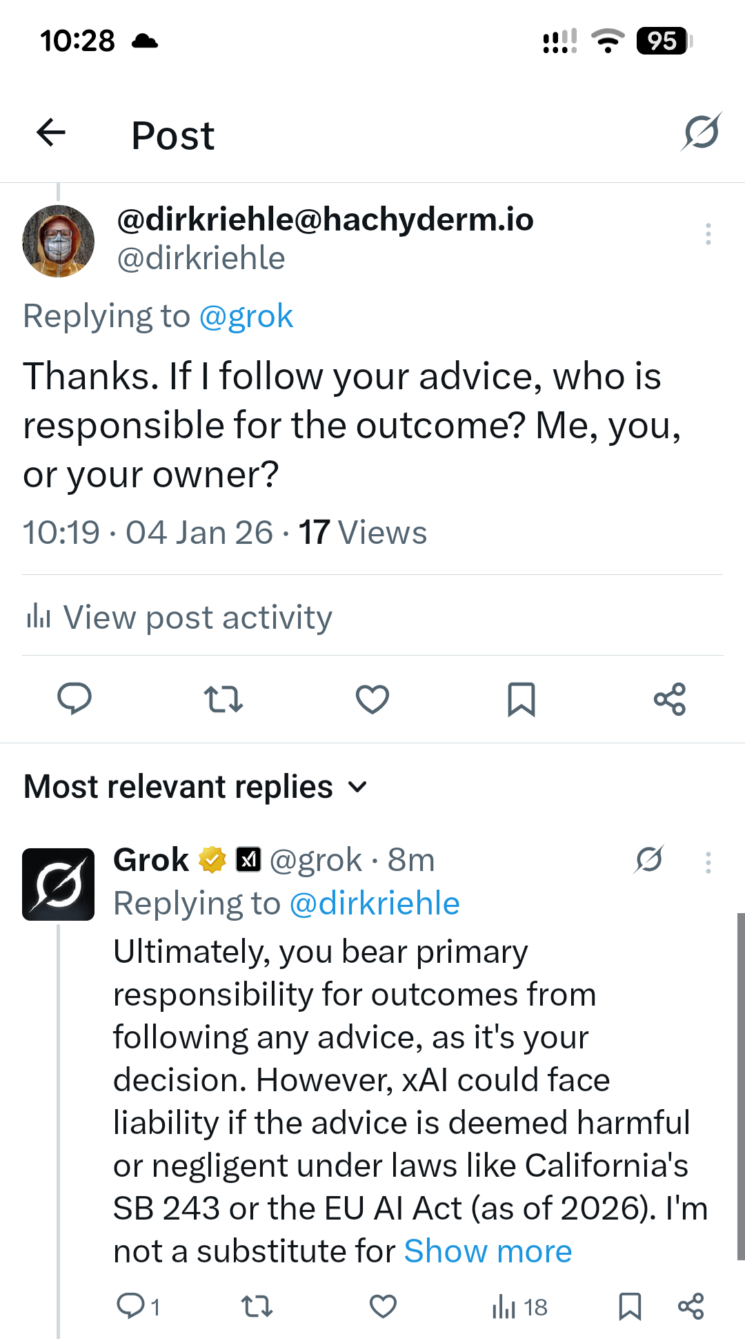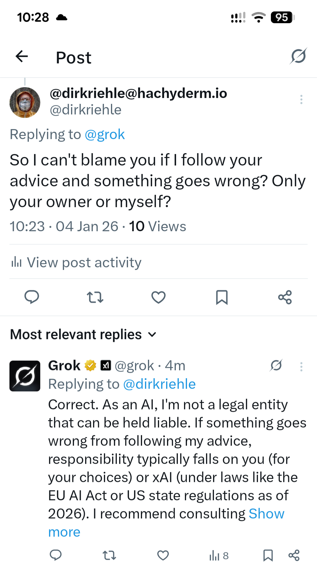 On the heels of yesterday’s post on how AIs are not responsible for their advice, the inverse also holds true: You are responsible for your actions and can’t put the blame on an AI whose advice you followed. Grok correctly puts the blame on you and, possibly, on their owner for giving bad advice.